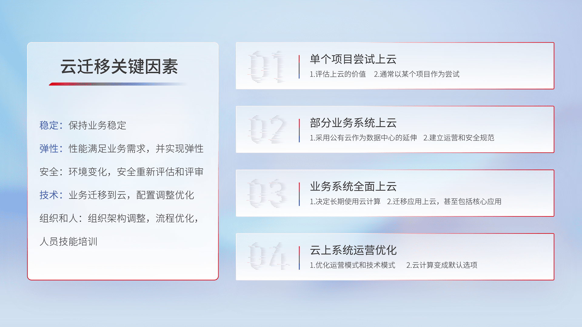 结合实际业务,,从规划设计、、、、云平台选型、、、、云原生改造、、、、数据迁移、、集成交付,,,,迁移全过程为客户识别最佳上云路径,,,做好风险识别管理,,,设计网络架构、、、、身份权限、、、、安全审计合规、、操作审计、、、日志审计、、、监控告警策略、、多站点容灾设计等,,对云上基础设施进行整体规划,,,,提升IT治理水平,,,以满足弹性、、、、高可用、、、高性能的需求。。。