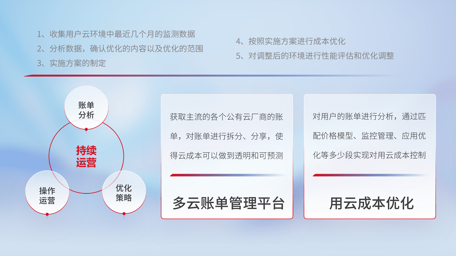 通过多云纳管,,,,以统一的资源数据模型把客户的云资源进行抽象和封装,,,,进而实现对多云资源的统一操作,,,保障云资源管理的可靠性、、、稳定性与可用性。。。。量身定制化运维内容,,,,配置、、开发运维、、补丁管理、、备份、、、监控、、、认证和访问管理、、审计和日常巡检等,,保障在用云过程中的可靠度,,,,稳定度以及高可用率。。。