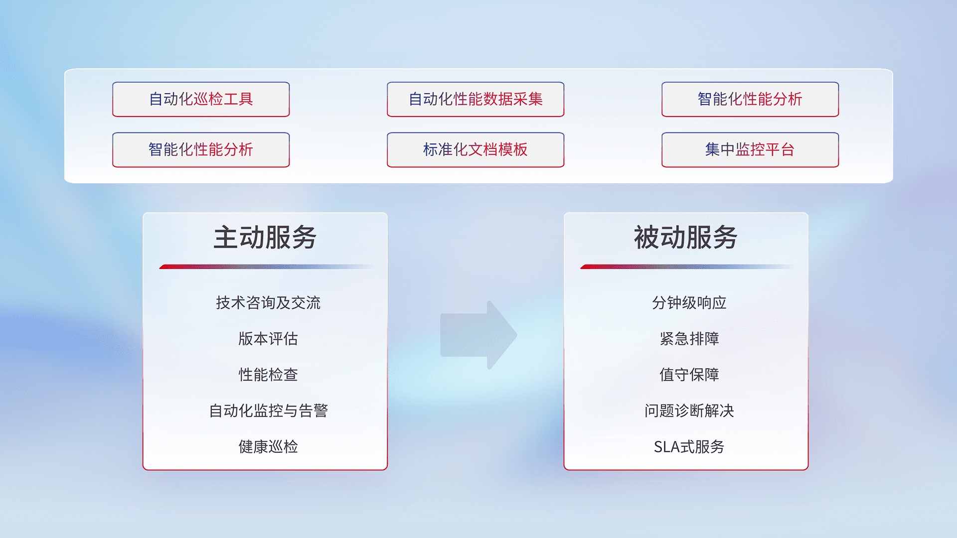 智能化工具和标准化文档,,,保障服务质量,,提供主动服务(包含技术咨询、、、、版本评估、、、性能检查、、自动化监控与告警、、健康巡检)和被动服务包含(分钟级响应、、紧急排障、、、值守保障、、问题诊断解决、、SLA服务)。。