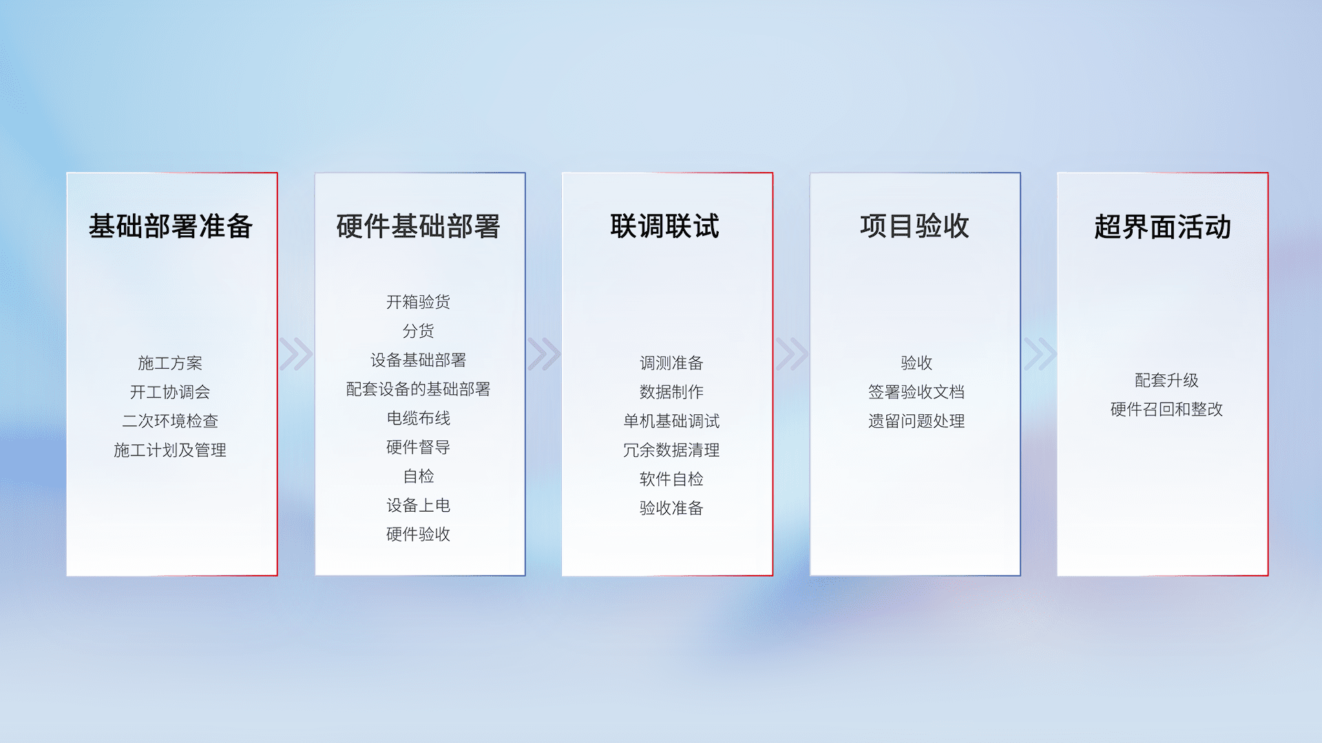 从基础部署准备、、、、硬件基础部署、、联调联试、、项目验收、、、越界面活动的全过程可追溯,,,保证施工质量和进度。。。
